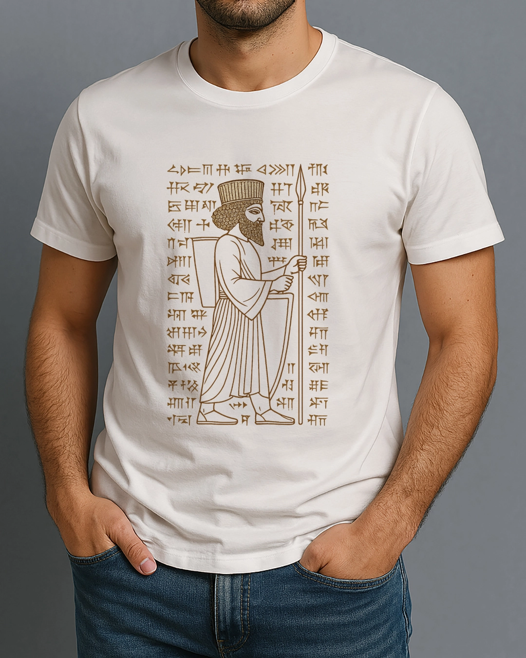 تیشرت نخ پنبه طرح سرباز هخامنشی و خطوط میخی